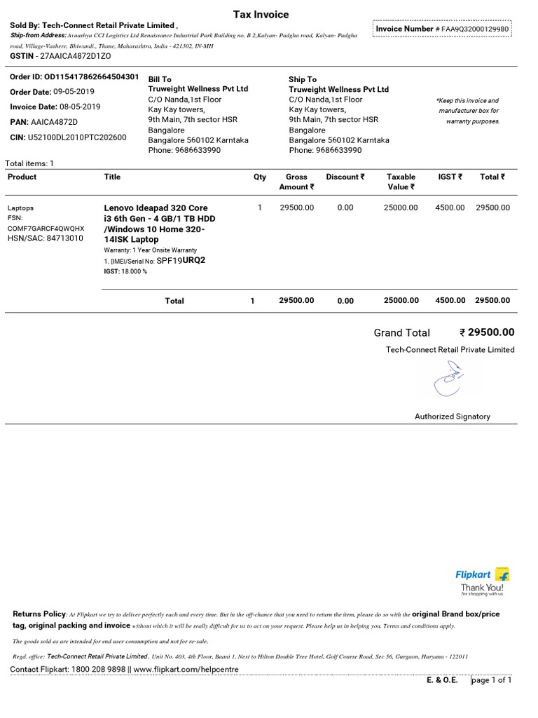 Od117380827492685000 Pdf Tax Invoice Sold By Tech Connect Retail Private Limited Invoice Number Fac9ta2002644485 Ship From Address J L No 9 55 And Course Hero - Tech connect services private limited's corporate identification number is (cin) u74900dl2008ptc180168 and its registration number is 180168.its email address is bharat.mohana@techconect.com and its registered address is unit no.